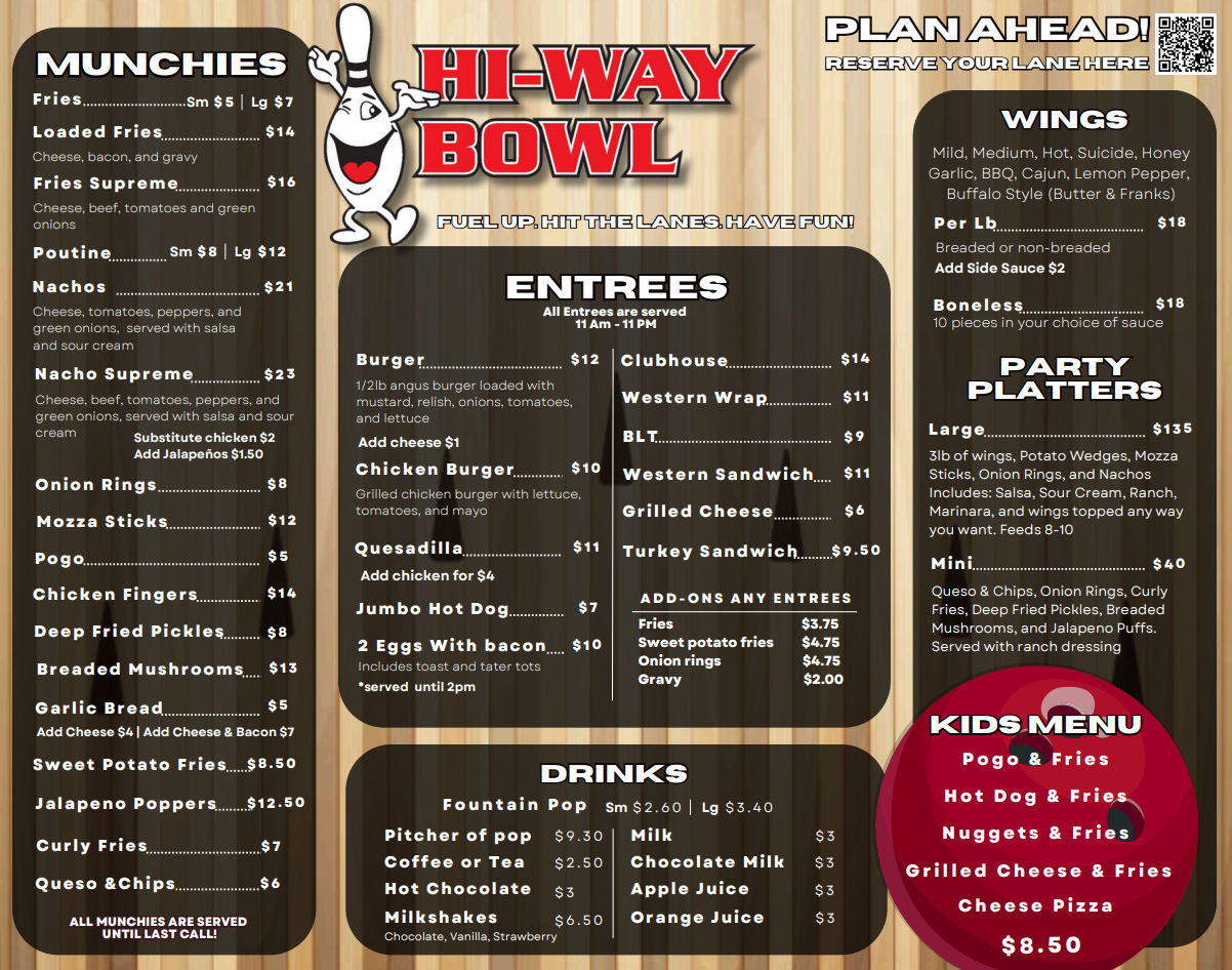 Before or after your games, or even if you’re not bowling, come in and enjoy a variety of freshly prepared munchies, burgers, wings, entrees and party platters.
